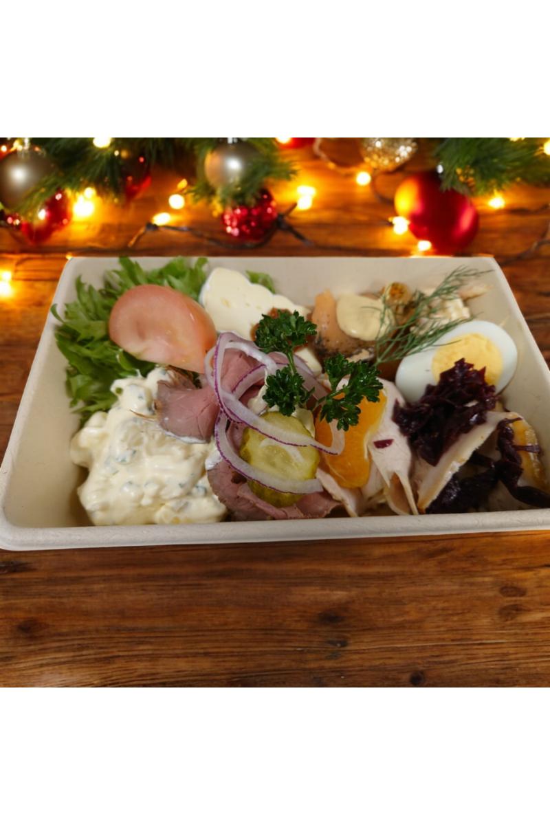 Inneholder: Gravet laks med egg og sennepsasu, Geir Arnes rekesalat, ribbe med rødkål og sennep, kalkun med waldorfsalat, roastbiff med potetsalat og syltede grønnsaker.