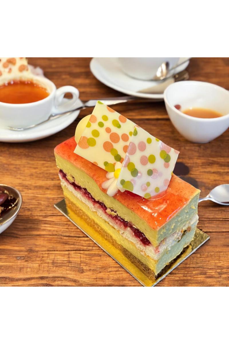Pistasjemousse med kirsebærkompott på sprø pistasjebunn