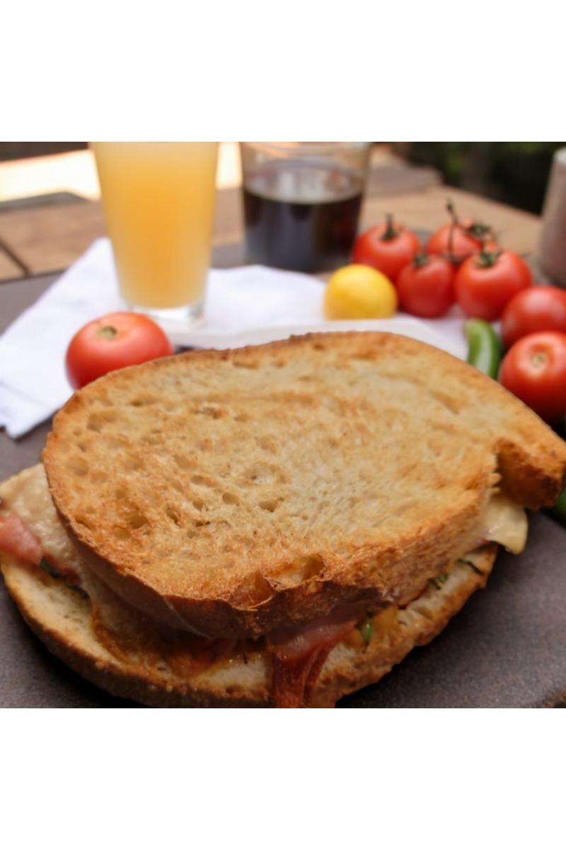 Toast med sennep, røkt skinke, gruyère, ruccula og sylta rødløk.