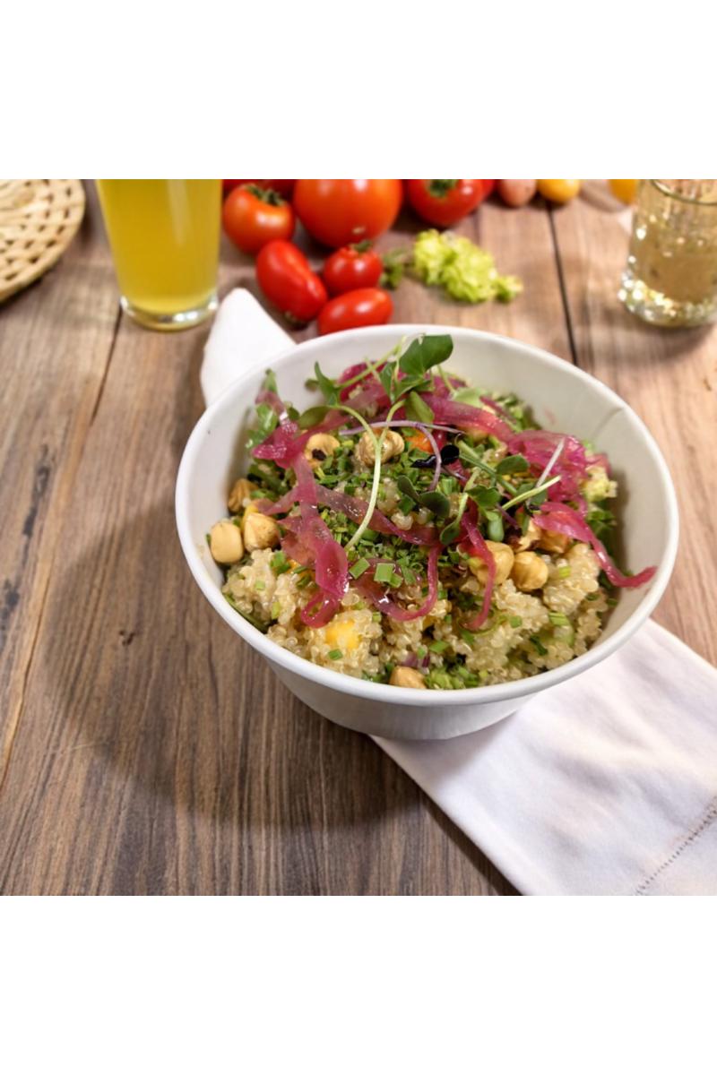 Quinoa, paprika, mango, avokado, ruccula, løk, gressløk, honningvinaigrette, sitron, hasselnøtter og syltet rødløk.