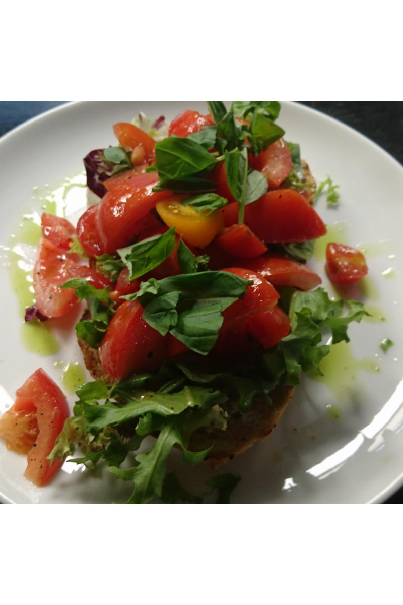 Grillet landbrød med hvitløksolje, toppes med solmodne tomater,vendt i en dressing av olivenolje, muskatelleddik.