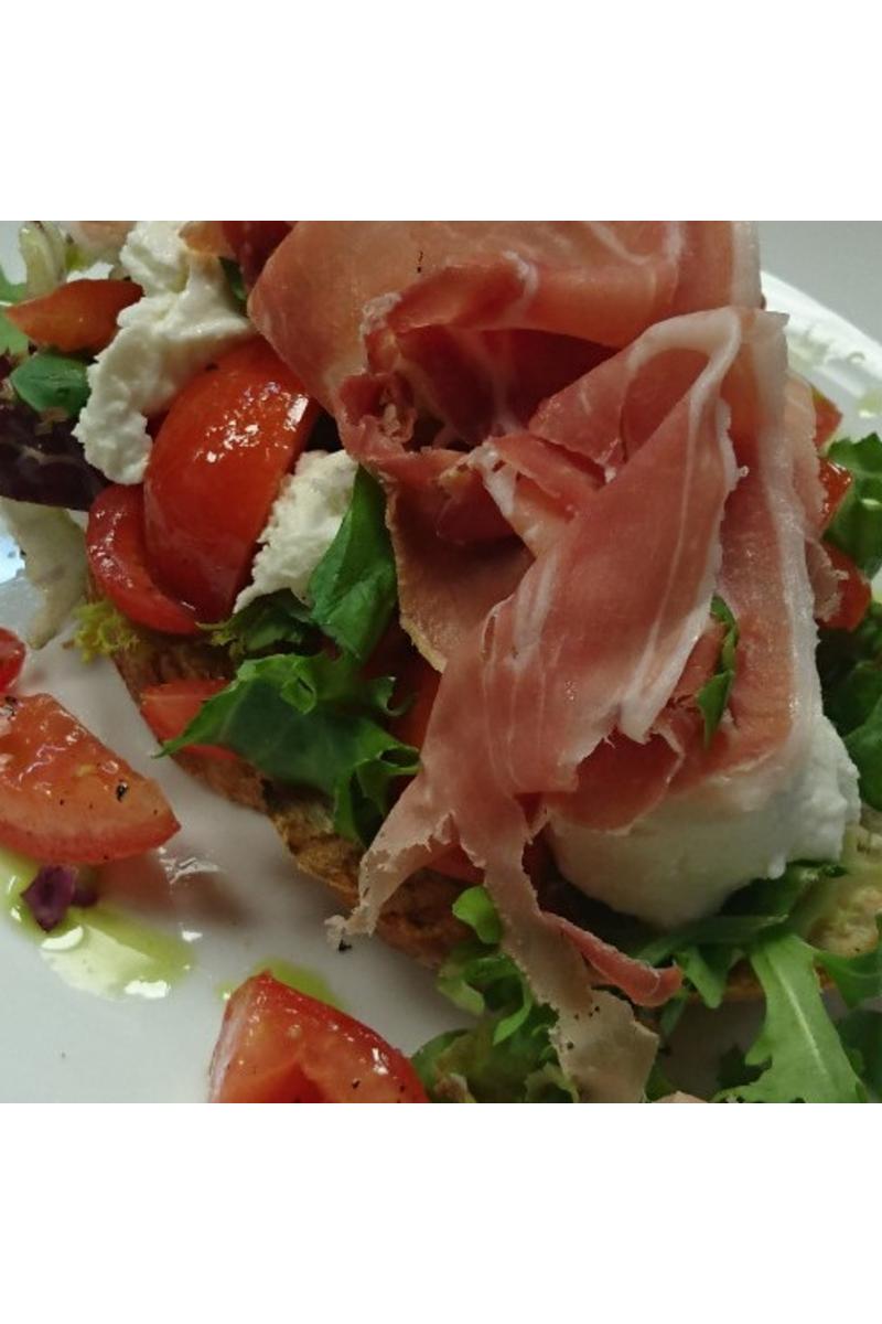 Grillet landbrød med hvitløksolje, toppes med solmodne tomater,vendt i en dressing av olivenolje, muskatelleddik, servert med parmaskinke.
