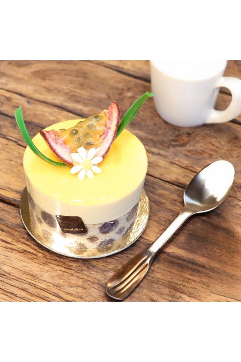 Frisk pasjonsfruktmousse med bringebærgele, på sjokoladebunn. Kaken er glutenfri og laktosefri.